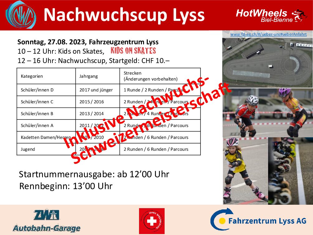 Zum Abschluss der Sommerferien organisiert HotWheels Biel-Bienne die nächste Etappe des Nachwuchscups in Ipsach. Am Sonntag 14. August 2022. Am Vormittag findet zudem ein Anfängerkurs „Kids on Skates“ statt. Es könne sich alle Kinder und Jugendlichen die Freude am Inlinen haben anmelden! Weitere Infos unter nachwuchscup.ch
